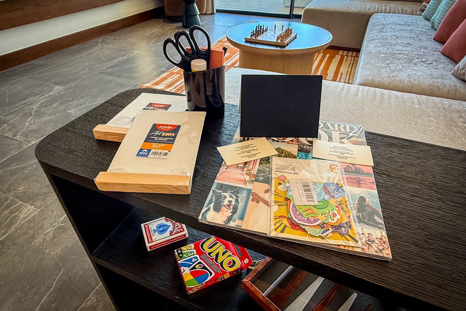 The suite’s living area was bathed in light, offering picture-perfect views of the ocean and swaying palm trees. A thoughtful touch was the vision board kit left by the W team, perfect for a relaxing evening while enjoying the massive TV. The suite also included a dining room, a wet bar stocked with local and imported beers and wines, and a record player with a curated selection of vinyl.