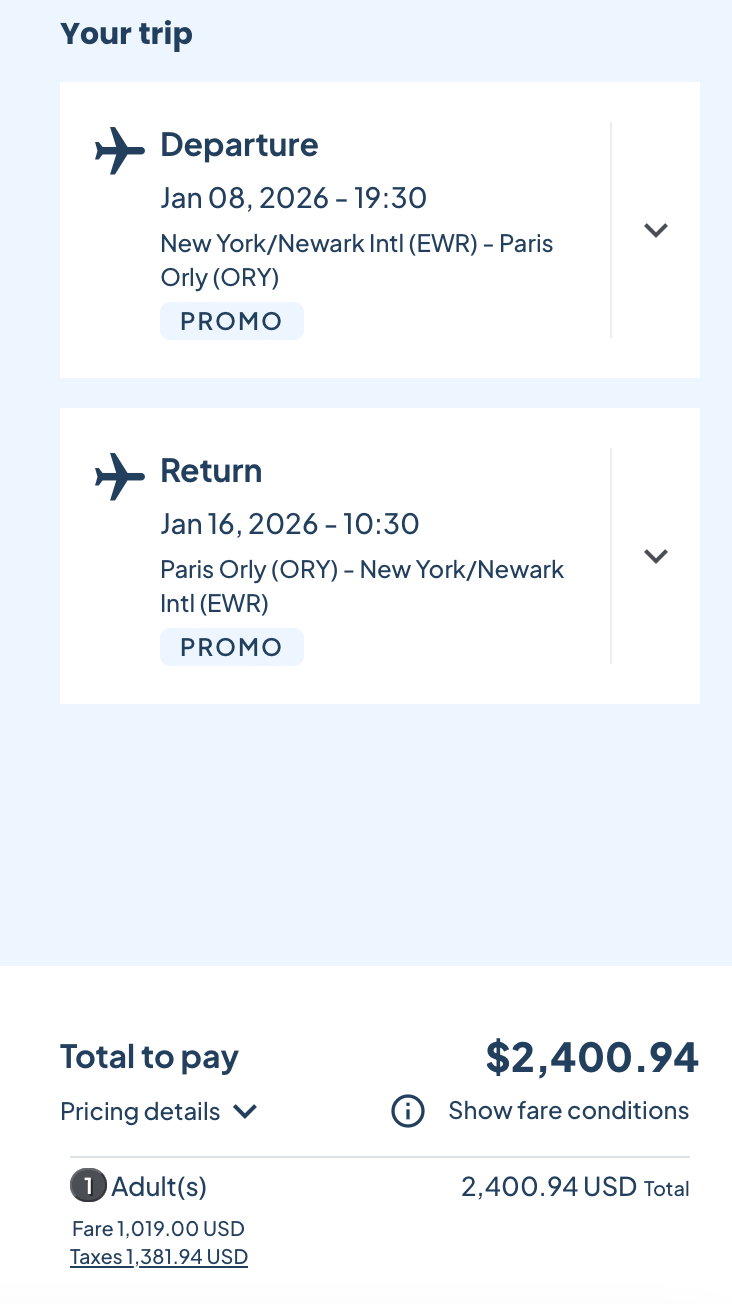 Specifically, fares from Newark Liberty International Airport (EWR) to Paris-Orly (ORY) and Milan Malpensa (MXP) begin at $2,400 round-trip. A trip to the glamorous French Riviera, flying into Nice Côte d'Azur Airport (NCE), starts at $2,700.
