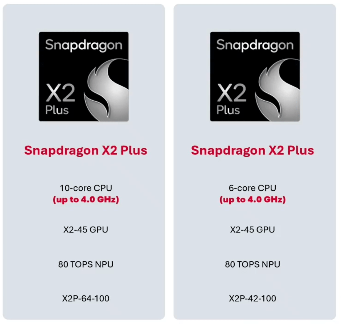 The 10-core X2 Plus boasts clock speeds up to 4.0GHz, paired with an X2-45 GPU. The 6-core variant mirrors these specifications. Both chips feature an 80 TOPS NPU, crucial for accelerating AI-powered tasks.