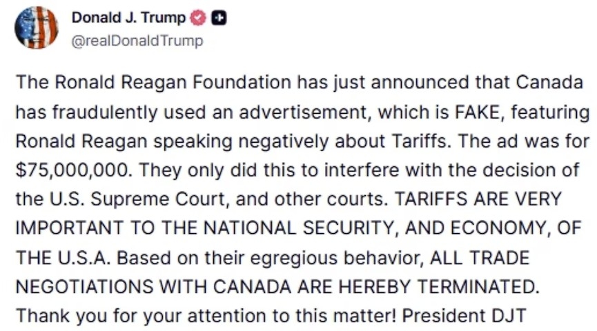 “TARIFFS ARE VERY IMPORTANT TO THE NATIONAL SECURITY, AND ECONOMY, OF THE U.S.A. Based on their egregious behavior, ALL TRADE NEGOTIATIONS WITH CANADA ARE HEREBY TERMINATED.”
