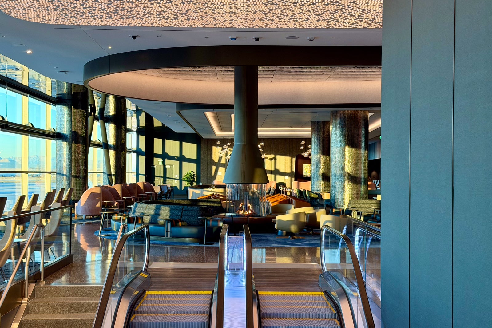 At the top of the escalator, you'll find the lounge's fireplace, which basically bifurcates the space.