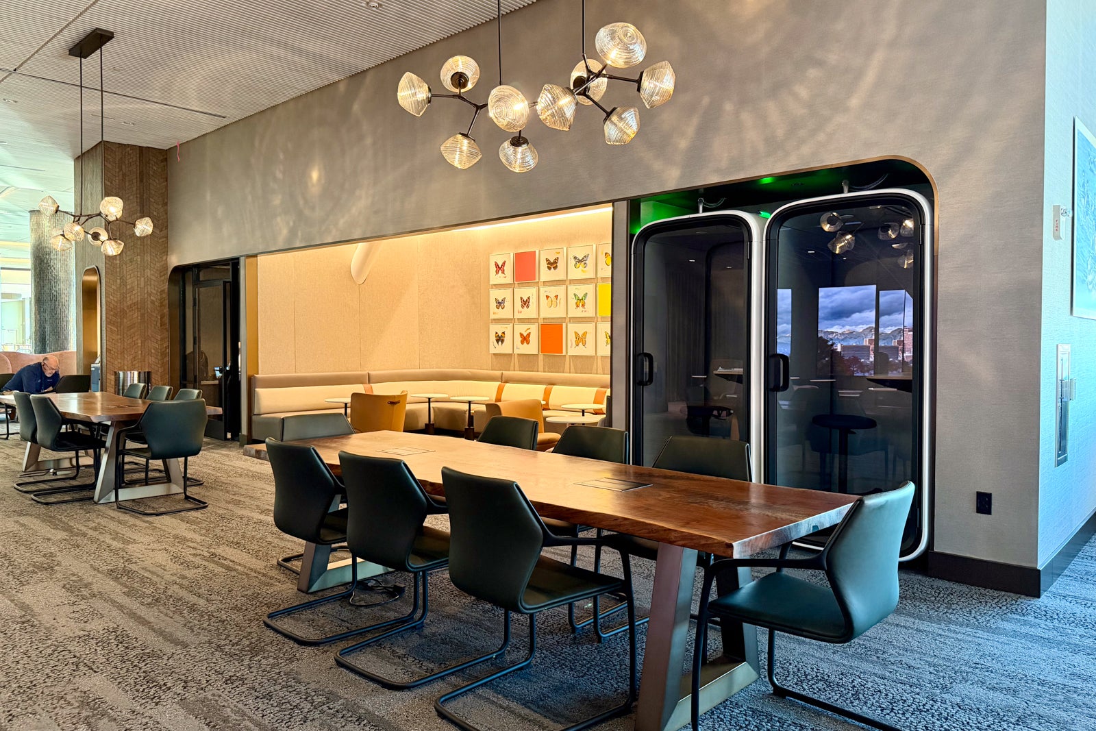 The lounge features a whopping nine Framery phone booths — six on the entrance level and three on the main level.