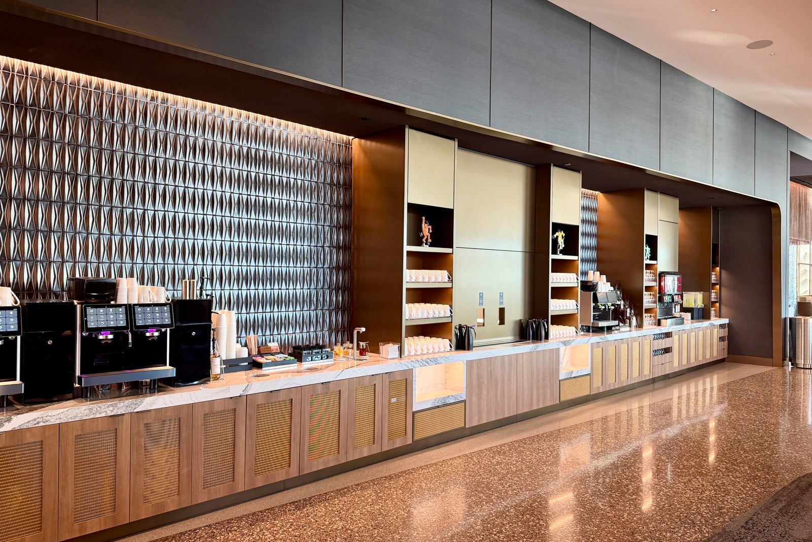 For those looking to quench their nonalcoholic cravings, there are two beverage walls on the sides of the lounge. Here you'll find fountain sodas, Eversys coffee machines, Starbucks drip coffees and more.